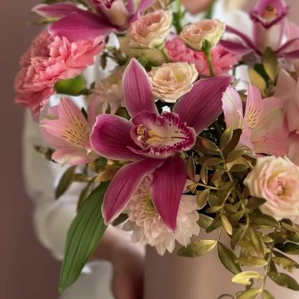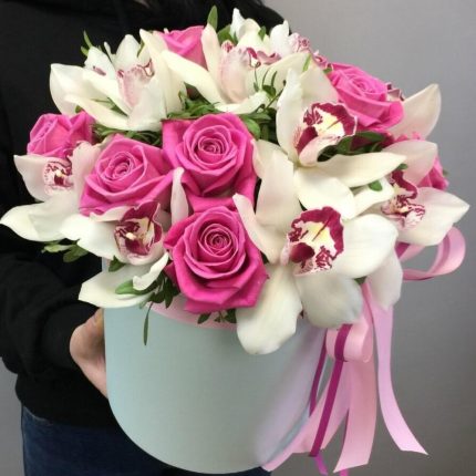 Композиция в шляпной коробке с орхидеями и малиновой розой “Малинка”, размер L