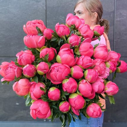 Раскидистый букет с пионами корал шарм и белыми тюльпанами / 1365 id