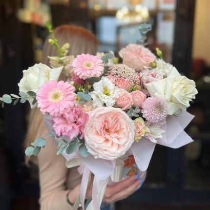 Цветы в коробке с пион розами,сиренью,ранункулюсами,эустомой,тюльпанами,матиолой,пионовидными кустовыми розами