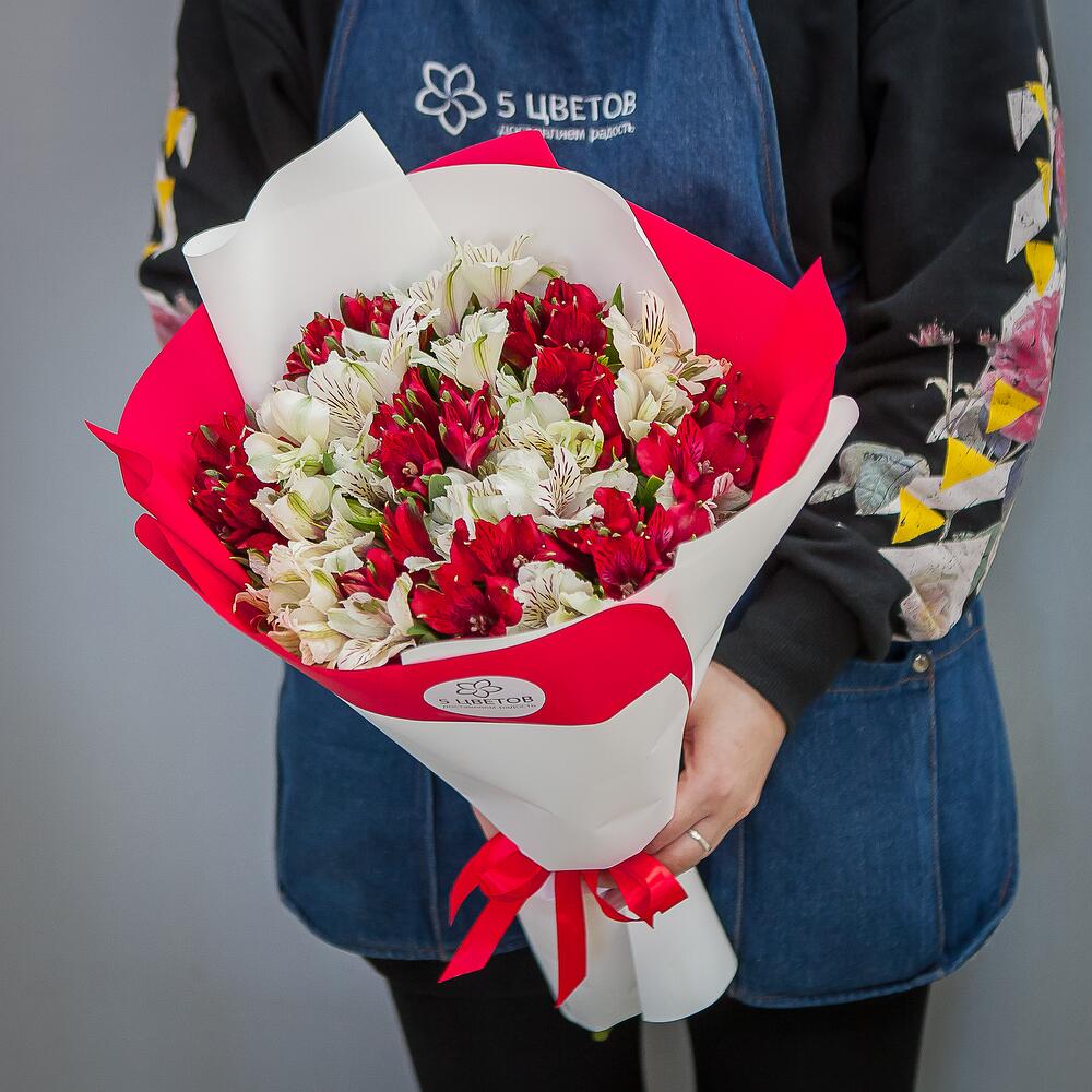 альстромерия красные – 8 шт.альстромерия белые – 7 шт.Упаковка крафт – 1 шт.Атласная лента – 1 шт.