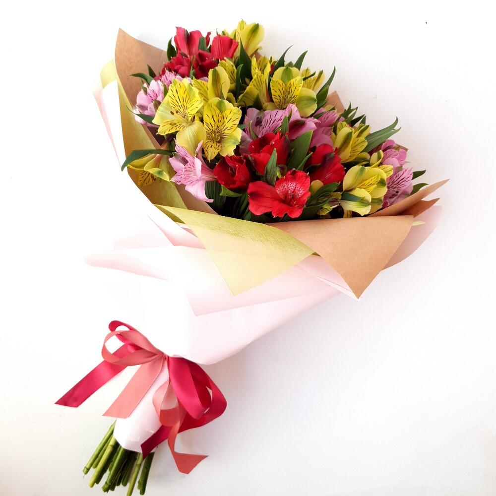 Лента атласная – 2 шт.Упаковка дизайнерская – 3 шт.Открыточка с вашими пожеланиями – 1 шт.Альстромерия Микс Европа – 15 шт.любовь флориста (бесплатно) – 1 шт.