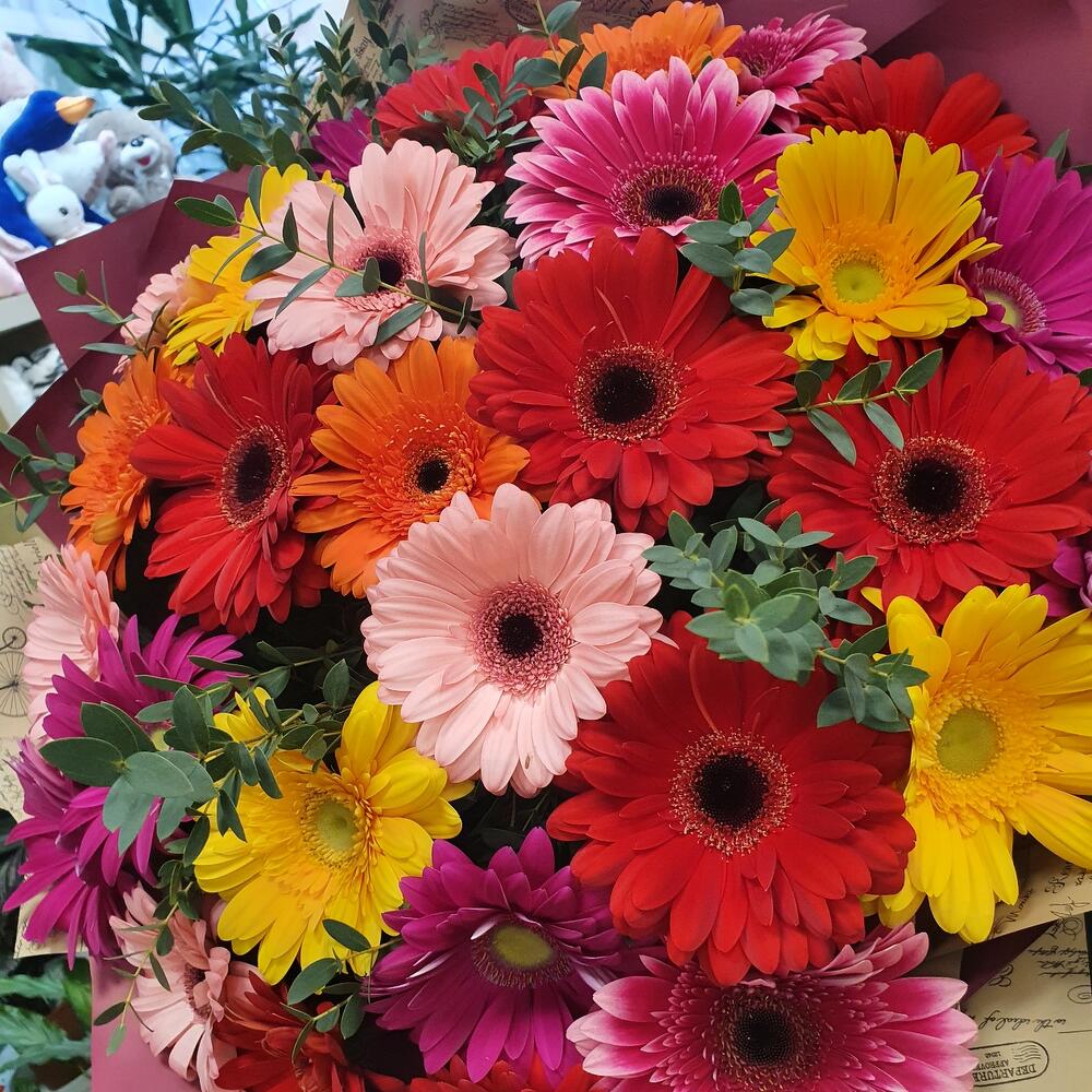 Монобукет 35 гербер с эвкалиптом