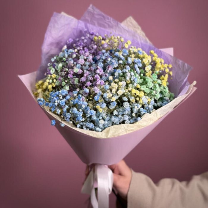 гипсофила радужная – 3 шт.Тишью – 1 шт.Пленка – 1 шт.Лента – 1 шт.