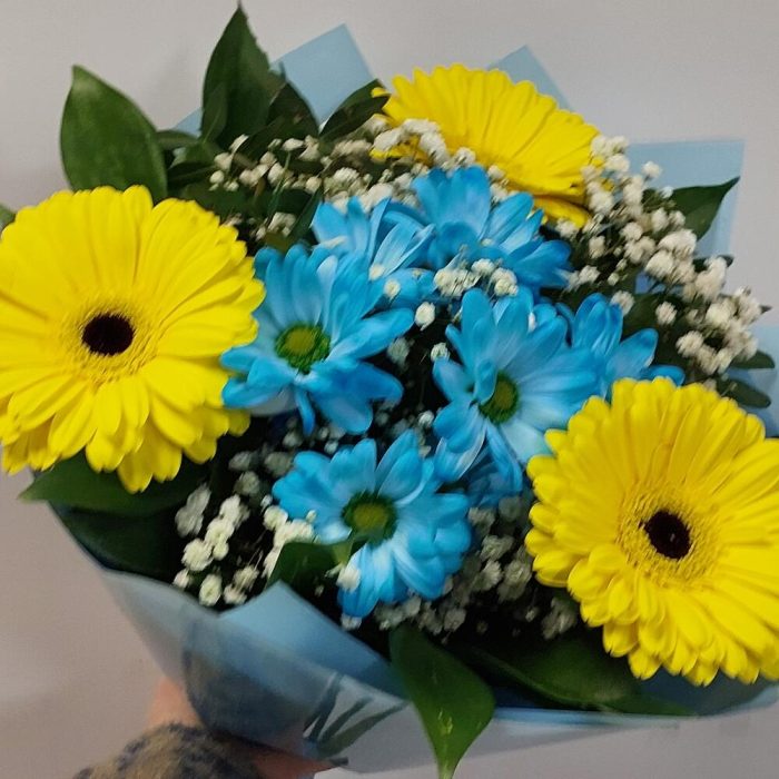 Гербера – 3 шт.хртзанткма кустовая ромашка – 1 шт.Рускус сочи – 10 шт.Гипсофила – 2 шт.фисташка зелень – 1 шт.Упаковка дизайнерская – 1 шт.Лента – 1 шт.