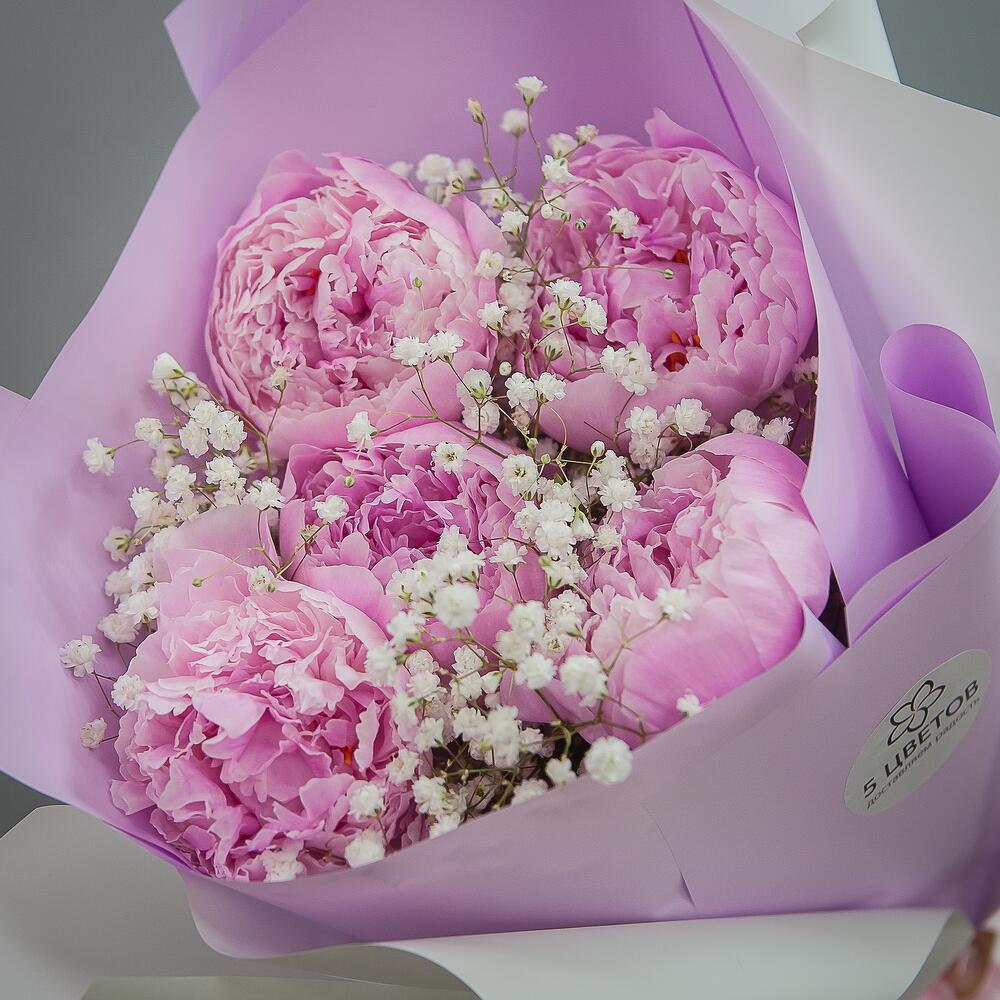 Букет из 5 розовых пионов с гипсофилой