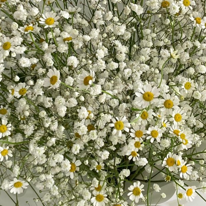 Гипсофила – 5 шт.Упаковка дизайнерская – 1 шт.Матрикария (ромашка) – 7 шт.