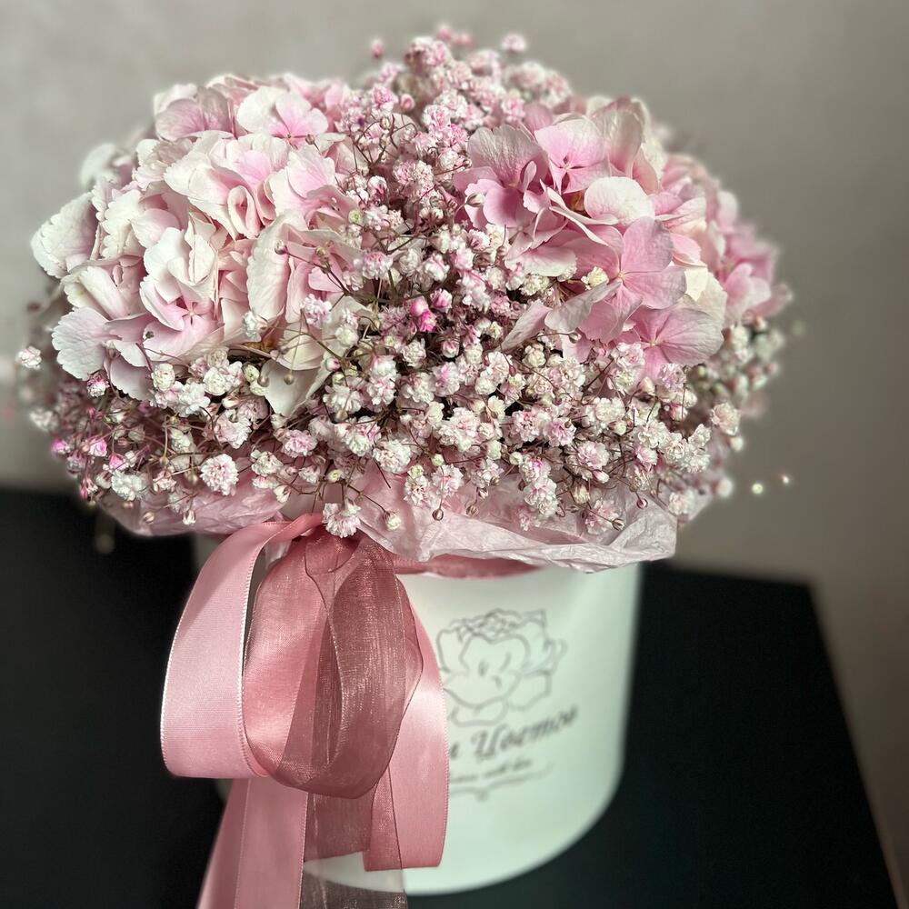 шляпная коробочка l – 1 шт.Флористическая губка (оазис) – 1 шт.Тишью – 1 шт.Атласная лента – 1 шт.Гортензия – 3 шт.Гипсофила – 7 шт.