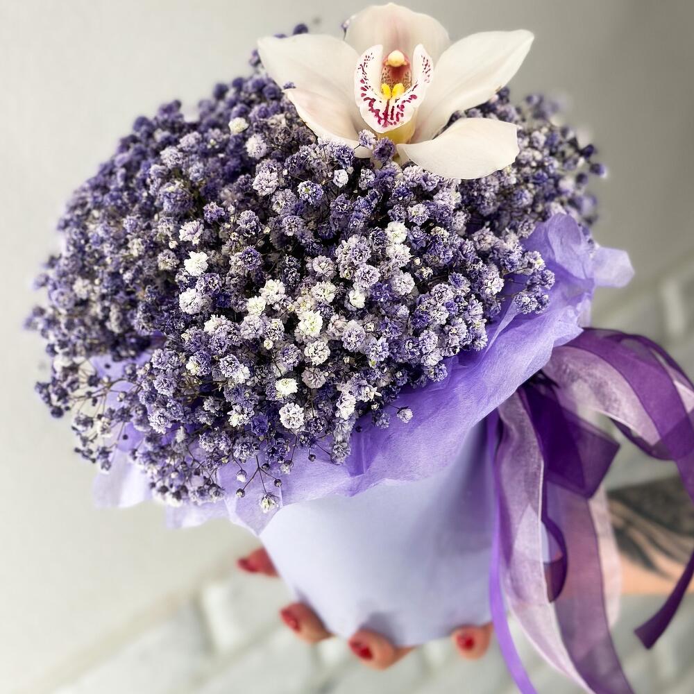 Играющая, сиреневая гипсофила с долгоиграющей Орхидеей собрана в одну стильную шляпную коробку!Благодаря пышности этих цветов,букет смотрится словно воздушный закат уходящий вдаль!Яркий и необычный комплимент для любого повода!Добавляйте товар и магазин в избранное,чтобы было легче нас найти