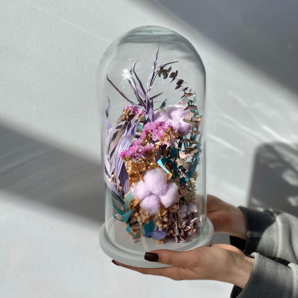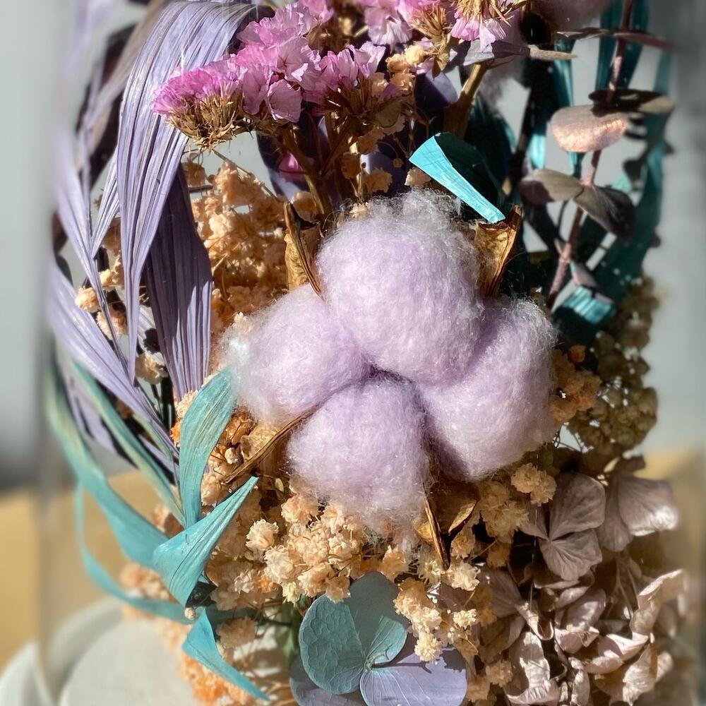 Хлопок – 2 шт.Статица – 1 шт.Эвкалипт Baby Blue – 1 шт.пальмовый лист – 3 шт.Гипсофила – 2 шт.Озотамнус – 3 шт.Эвкалипт цинерея – 1 шт.