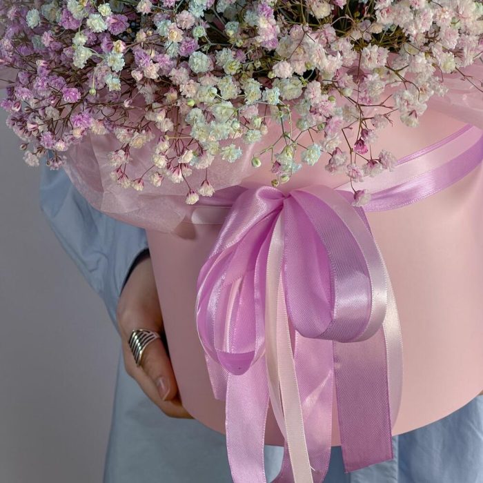 Гипсофила – 9 шт.Лента – 1 шт.Тишью – 1 шт.Коробка шляпная – 1 шт.Оазис флористический – 1 шт.