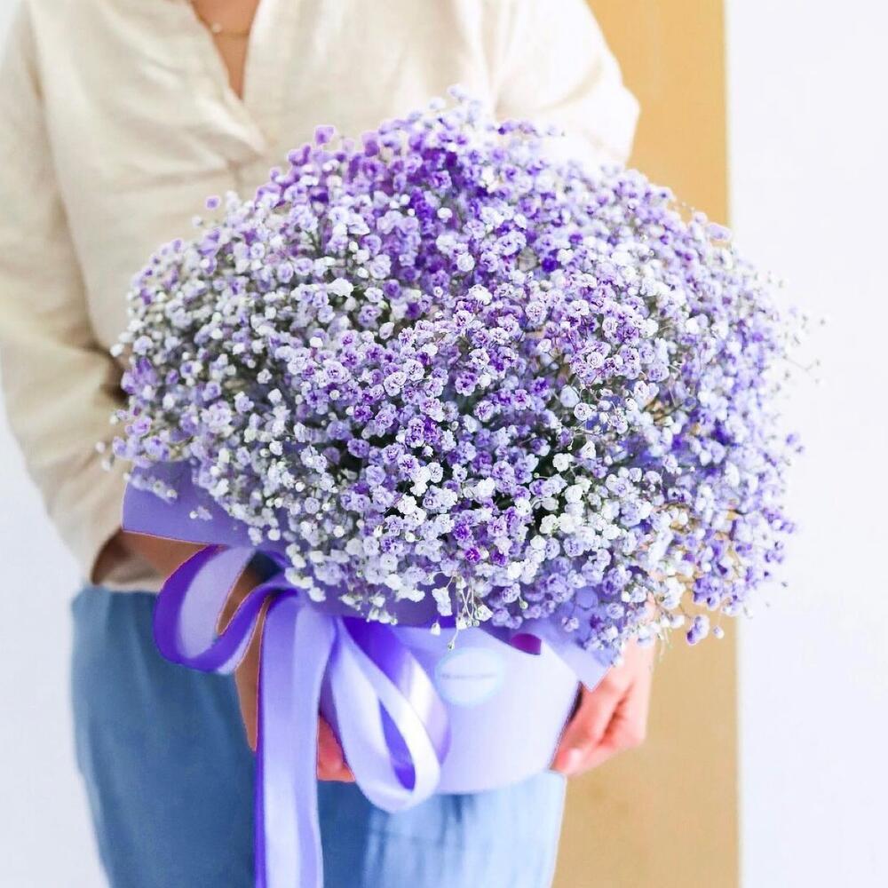 Очаровательная, воздушная композиция из гипсофилы, в шляпной коробке.Цветы стоят в специальной флористической губке,что позволяет им больше оставаться свежими и радовать получателя. Так же композиция в коробке это очень удобно и эффектно, так как не надо ставить букет в вазу и менять воду. Необходимо лишь подливать в губку воду.Инструкция по уходу за цветами прикреплена к каждому заказу.Цветы гипсофилы отличаются стойкостью и даже при высыхании не теряют, декоративности и цвета. Что позволяет, долгое время украшать интерьер в качестве сухоцветов.Подпишем открытку с вашими пожеланиями бесплатно