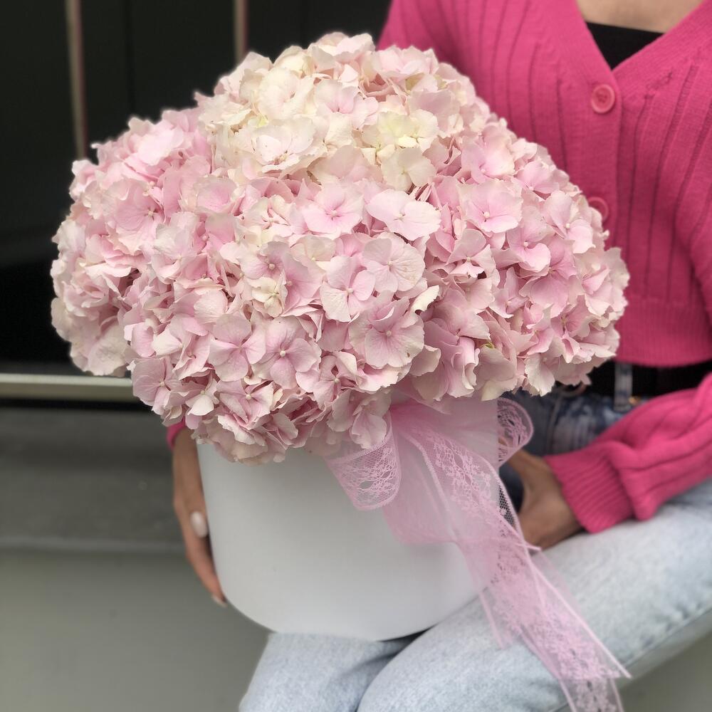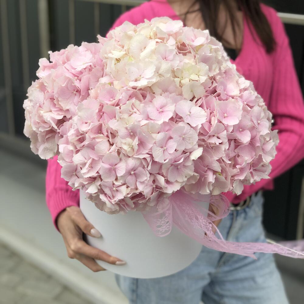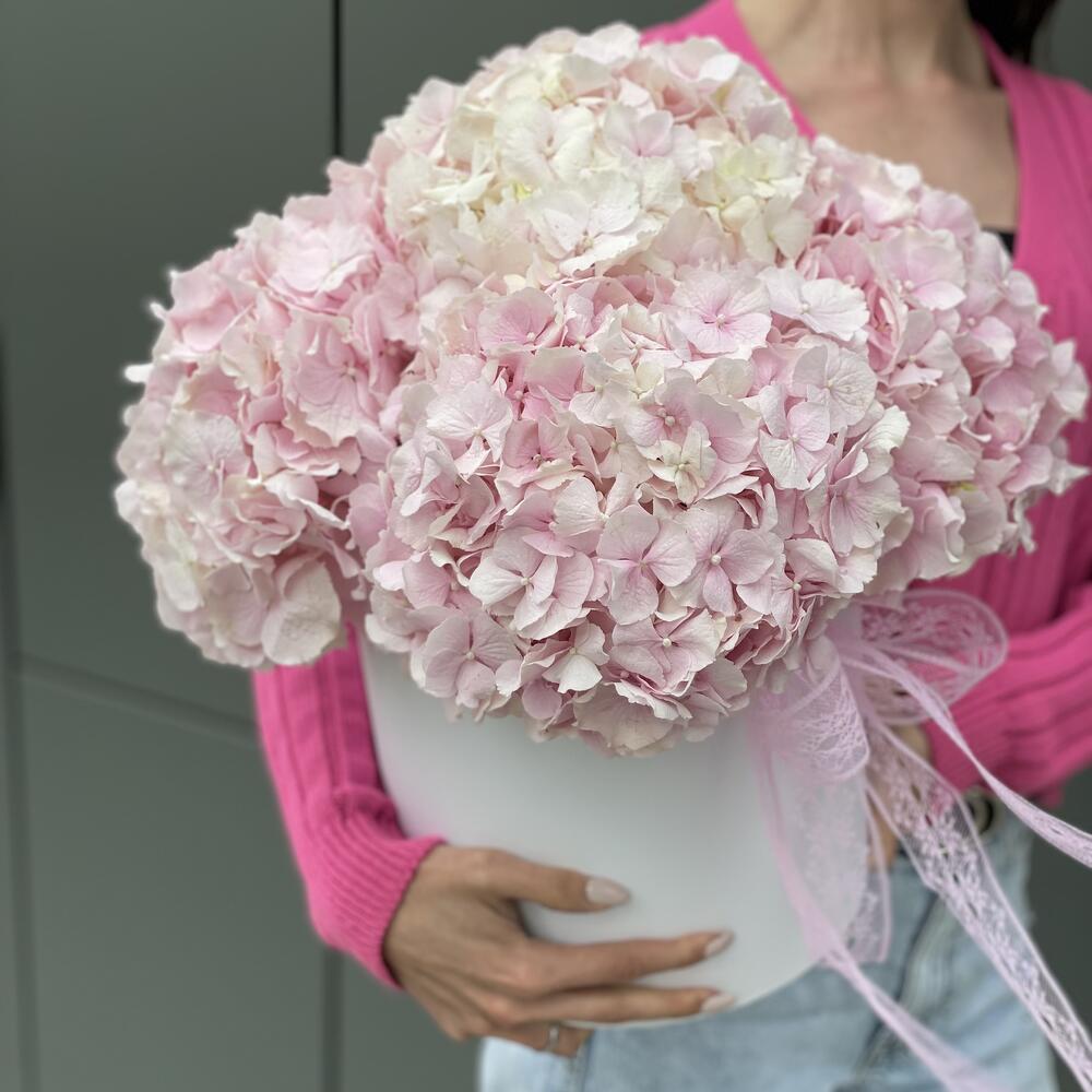 Оазис – 4 шт. Коробка – 1 шт. Оформление – 1 шт. Гортензия розовая – 5 шт.