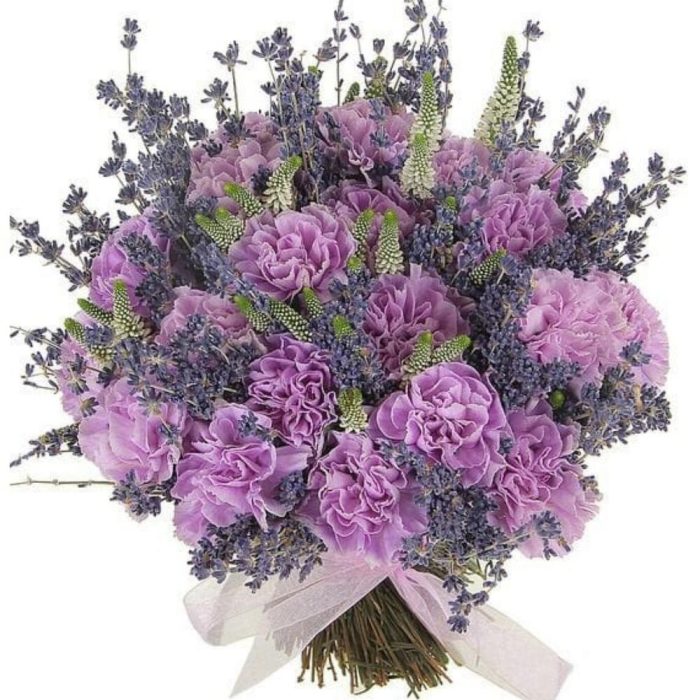 Гвоздика – 25 шт.Лаванда (сухоцвет) – 50 шт.Лента атласная – 1 шт.цветы сезонные – 9 шт.