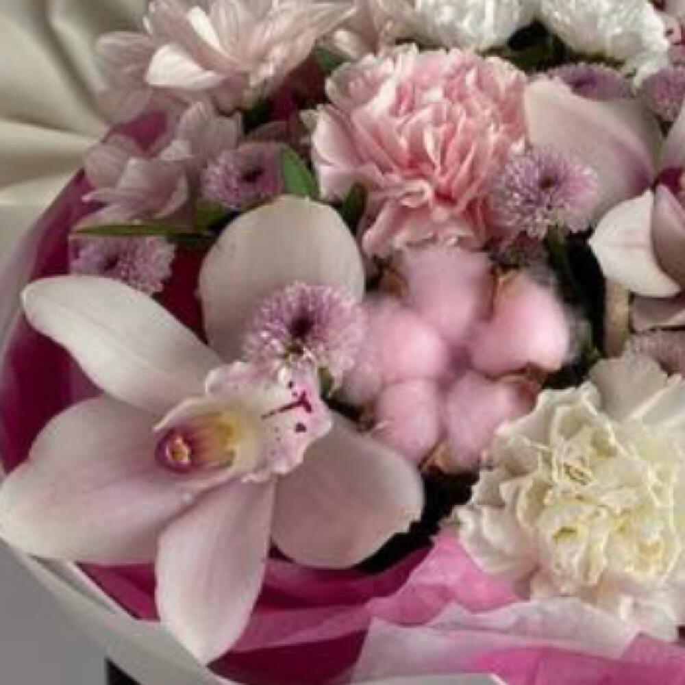 Орхидея Цимбидиум – 3 шт.Хлопок – 1 шт.Хризантема кустовая – 1 шт.Лента атласная – 2 шт.Сантини – 4 шт.Гвоздика сортовая – 3 шт.Пленка матовая – 3 шт.Фисташка пучок – 1 шт.тишь розовое – 3 шт.