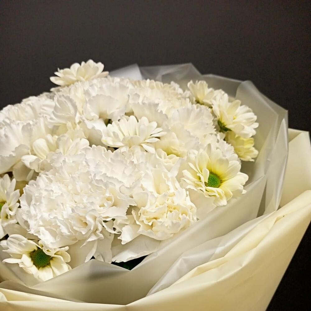 Диантус – 9 шт.Сантини – 6 шт.Упаковка дизайнерская – 1 шт.зелень декоративная – 3 шт.