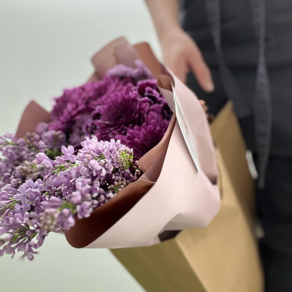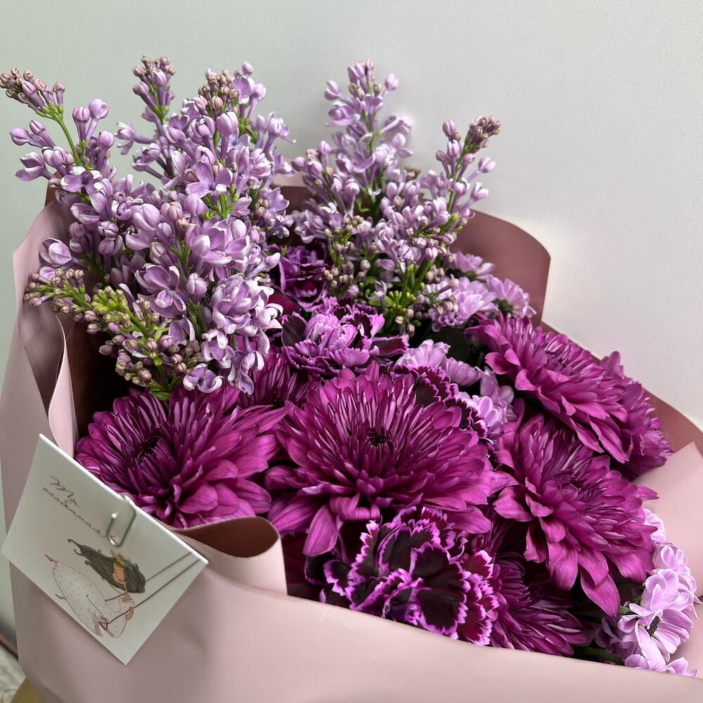Сирень сиреневая – 3 шт.Диантус – 5 шт.Хризантема кустовая – 2 шт.Сантини – 3 шт.