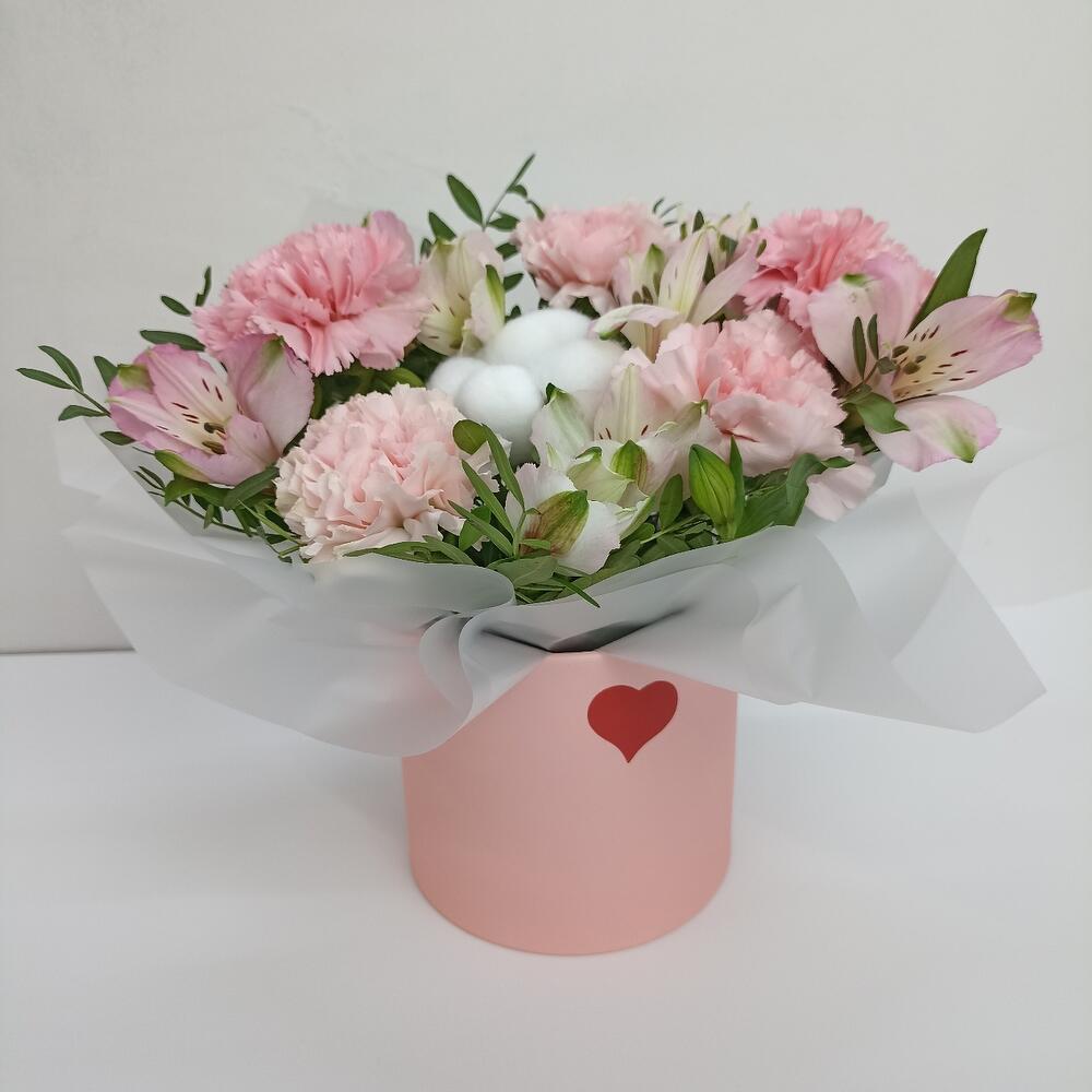 Альстромерия – 2 шт.Хлопок – 1 шт.Диантус – 5 шт.Фисташка – 2 шт.Оазис флористический – 1 шт.коробка маленькая – 1 шт.наклейка сердце – 1 шт.