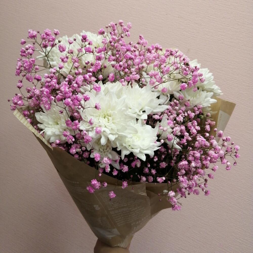 Хризантема кустовая – 3 шт.Упаковка – 1 шт.Лента атласная – 1 шт.Гипсофила розовая – 2 шт.