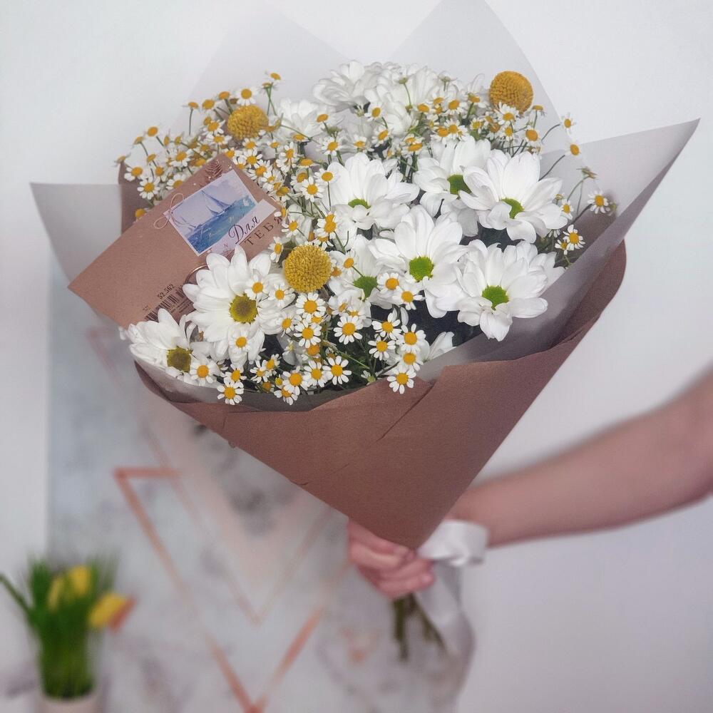 Лента атласная – 1 шт.Ромашка кустовая – 4 шт.Крафт упаковка – 1 шт.Пленка матовая – 1 шт.Открыточка с вашими пожеланиями – 1 шт.Хризантема кустовая белая бакарди – 3 шт.Краспедия желтая – 3 шт.держатель для открыток железный – 1 шт.