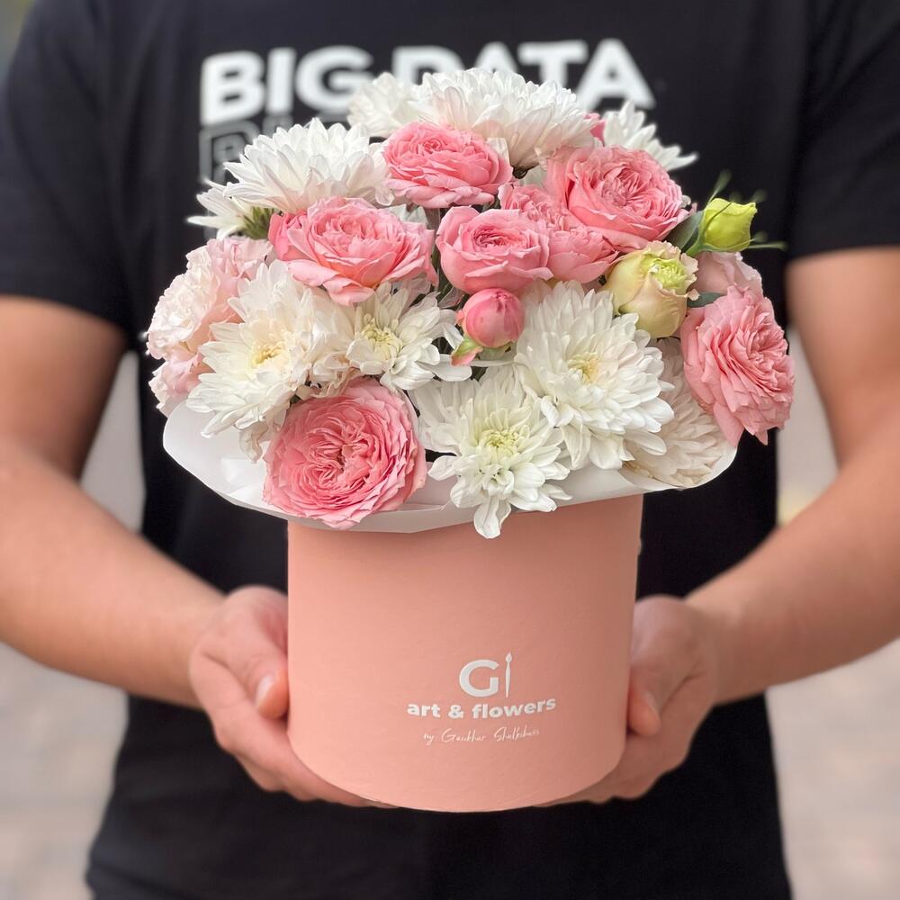 Хризантемы и Пионовидные кустовые розы в коробке + открытка ручной работы в подарок