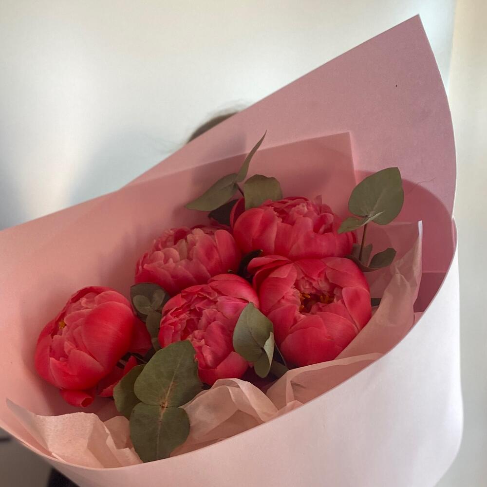 Пион Коралл Шарм (Coral Charm) – 5 шт.Эвкалипт – 5 шт.фоамтран – 2 шт.Лента атласная – 2 шт.Тишью – 2 шт.инструкция по уходу за цветами – 1 шт.хризал – 1 шт.