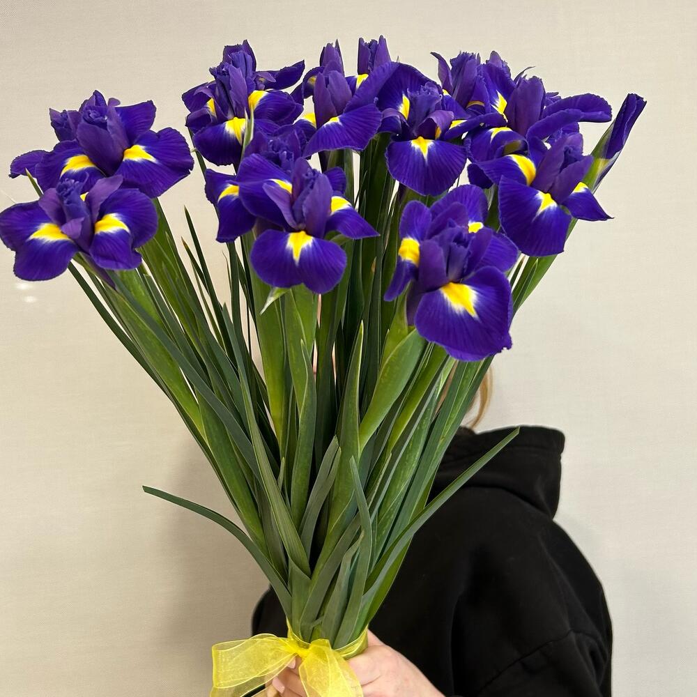 Букет из 19 фиолетовых ирисов в ленте