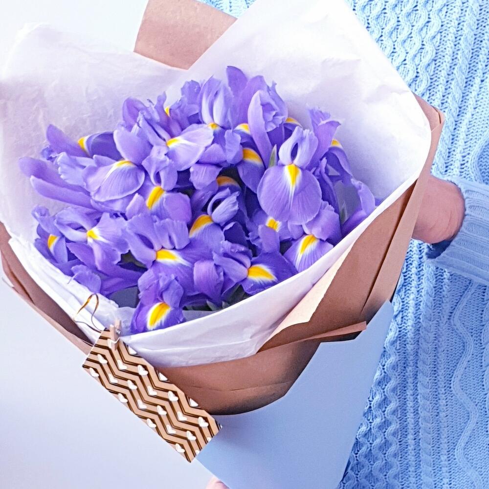 Лента атласная – 2 шт.Крафт упаковка – 1 шт.Ирис Blue Magic – 15 шт.Пленка матовая – 1 шт.Открыточка с вашими пожеланиями – 1 шт.Тишью белое – 2 шт.любовь флориста (бесплатно) – 1 шт.