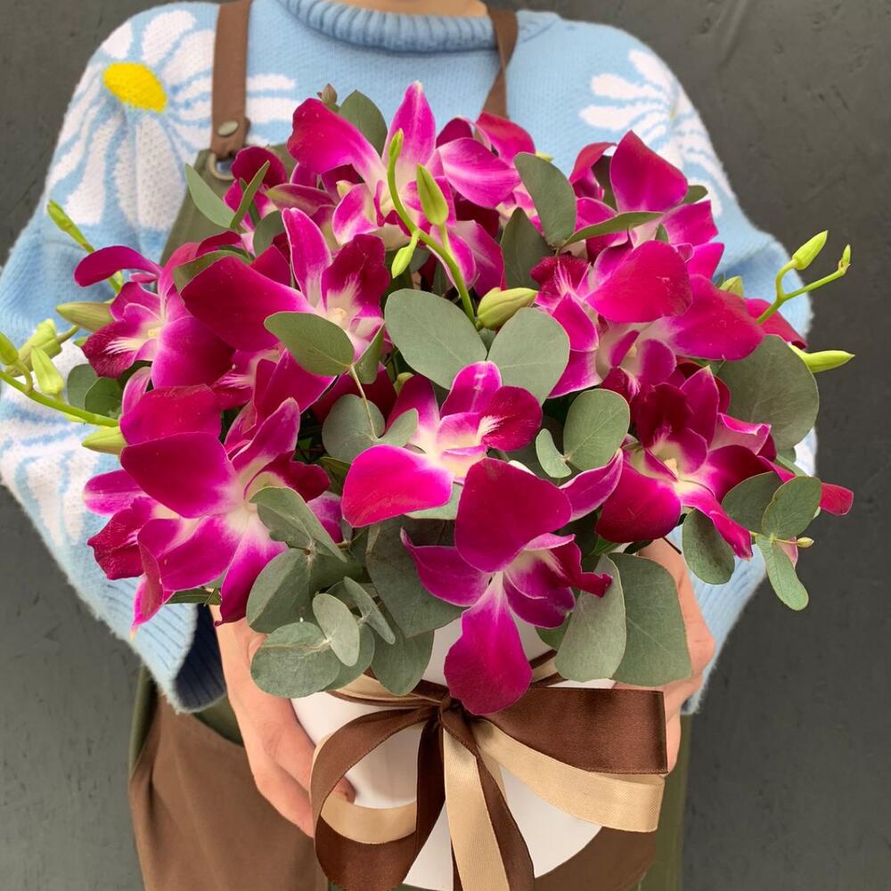 Орхидеи ( дендробиум ) с эвкалиптом в шляпной коробке