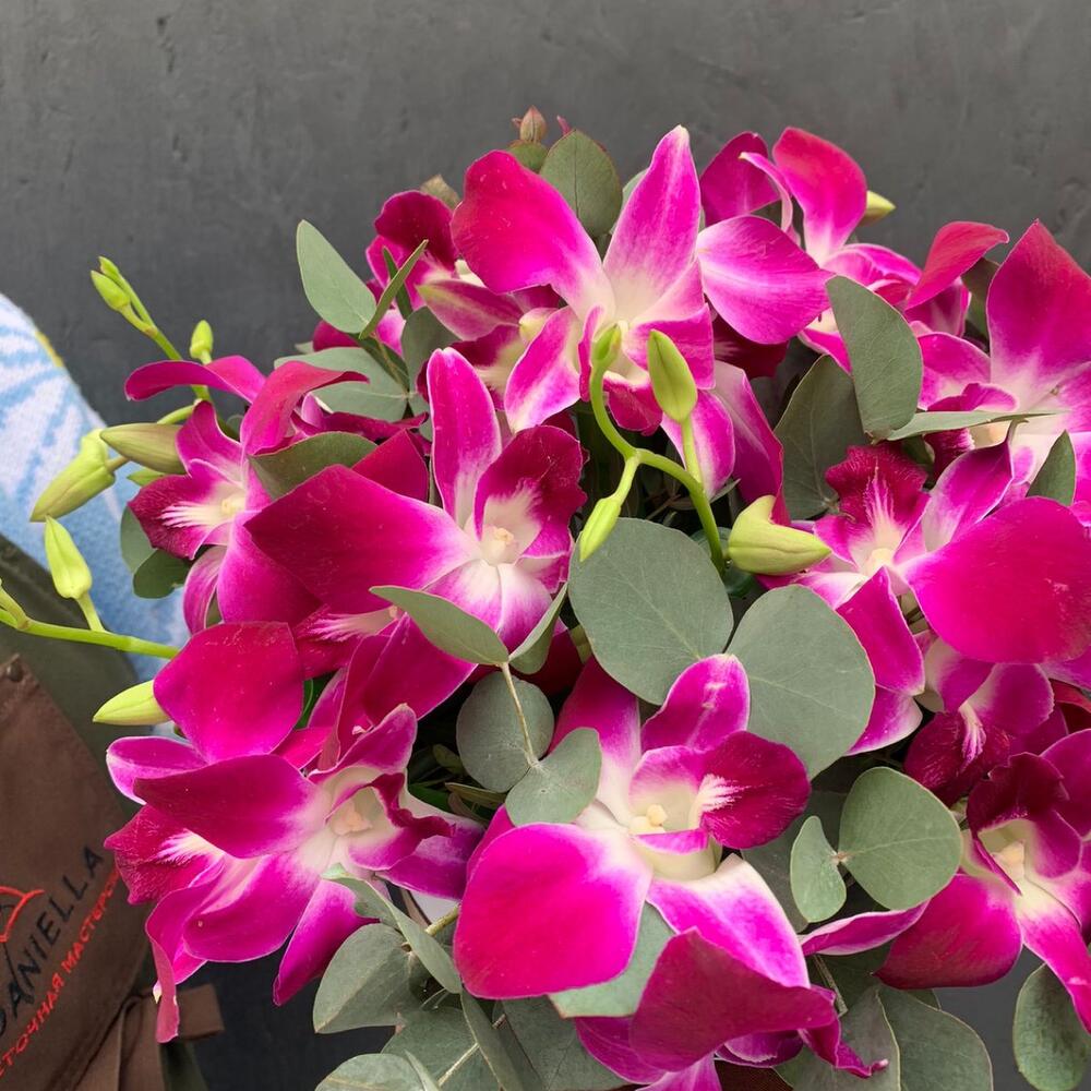 Дендробиум – 31 шт.удлинитель для орхидеи – 17 шт.Эвкалипт – 14 шт.Шляпная коробка с лентами – 1 шт.Оазис флористический – 127 шт.