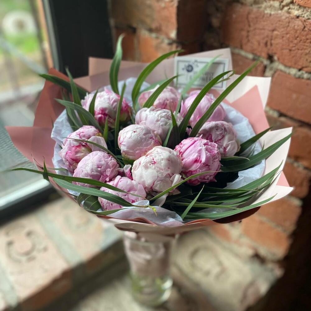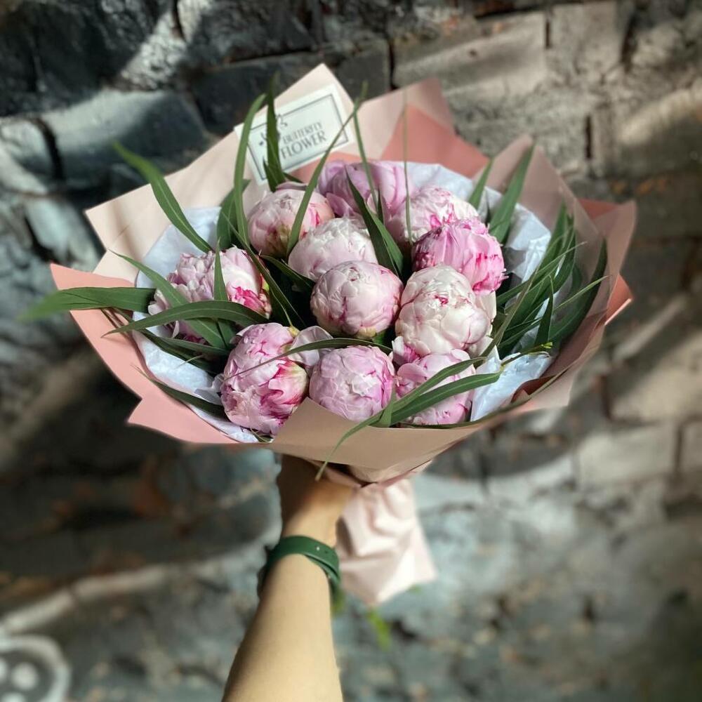 Букет из 11 пионов и эвкалипта в дизайнерской упаковке “Аромат пионового облака”