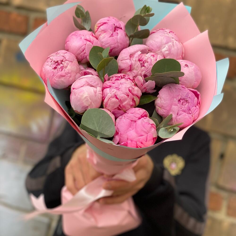 Эвкалипт – 5 шт.Лента атласная – 1 шт.Пион Сара Бернар – 11 шт.Упаковка дизайнерская – 1 шт.