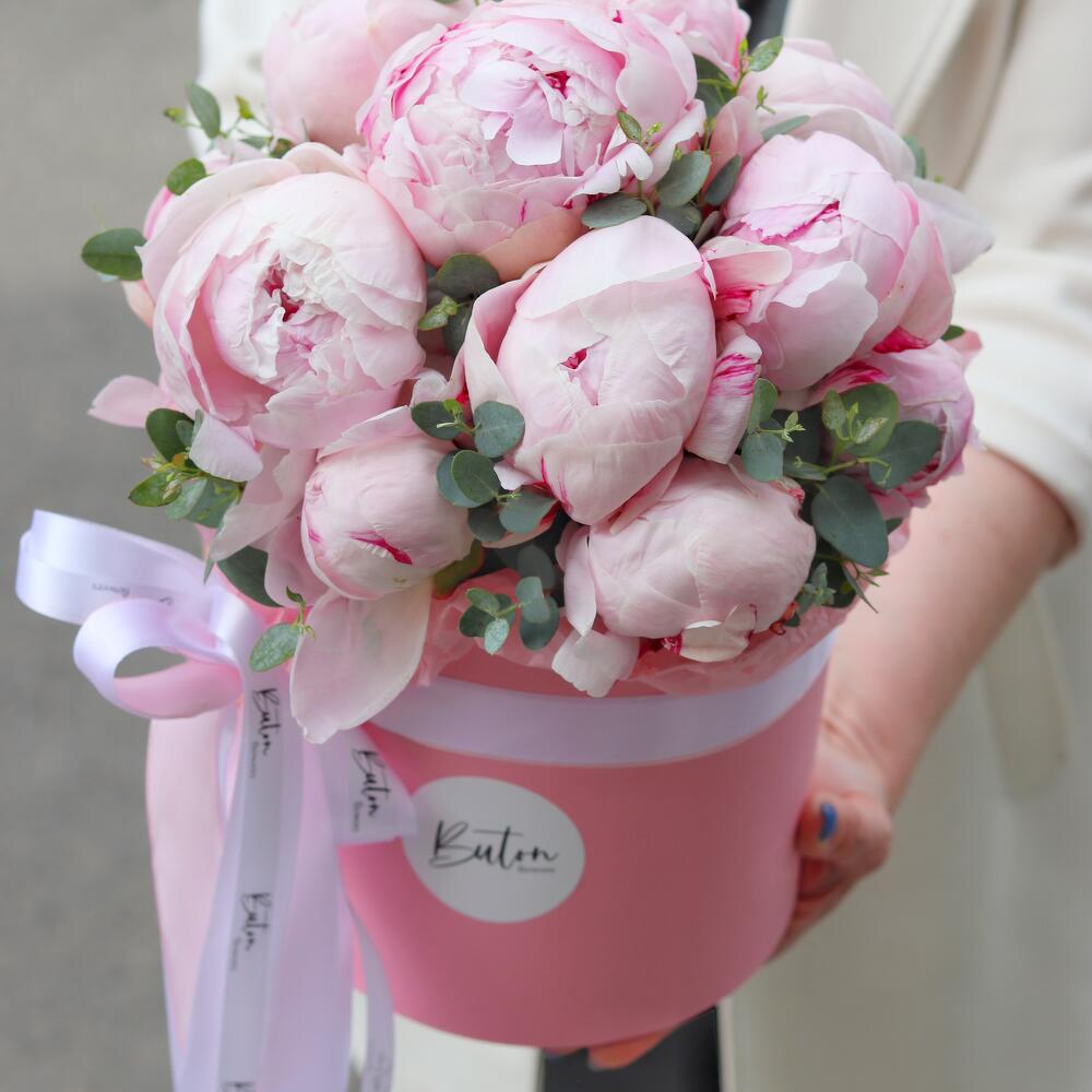 Пион – 13 шт.Эвкалипт – 2 шт.Шляпная коробка – 1 шт.Шоколадка – 1 шт.открытка с вашими пожеланиями – 1 шт.