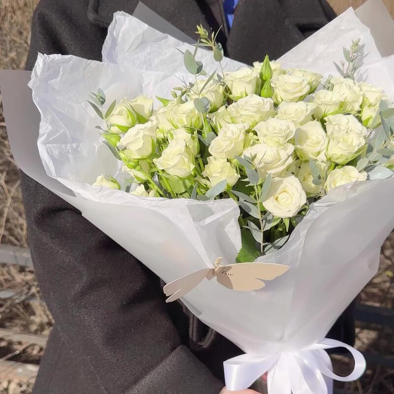 Роза кустовая – 11 шт.Эвкалипт – 3 шт.Лента атласная – 1 шт.Тишью – 2 шт.Пленка матовая – 2 шт.Открыточка с вашими пожеланиями – 1 шт.