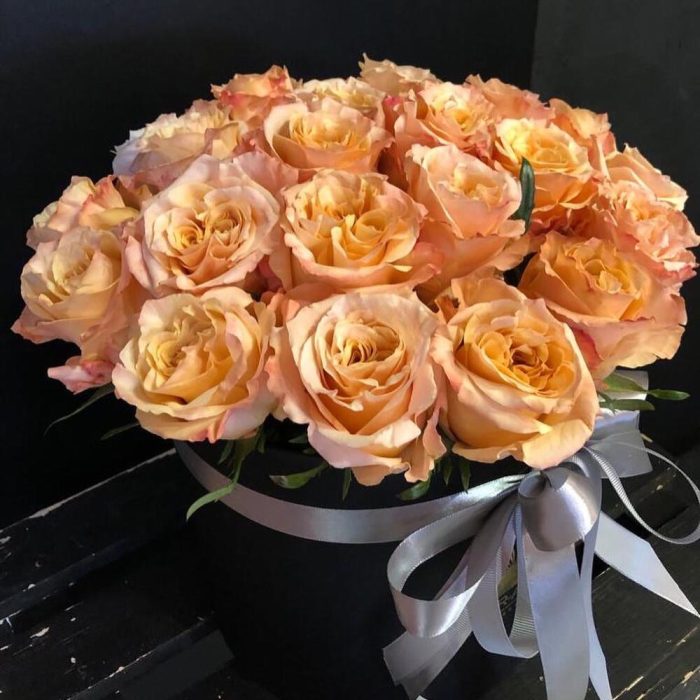 Коробка шляпная – 1 шт.Оазис флористический – 2 шт.Роза шиммер – 25 шт.