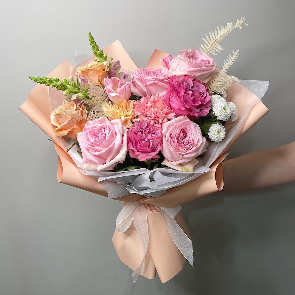 Диантус – 2 шт.Тюльпан пионовидный – 2 шт.Упаковка дизайнерская – 1 шт.Роза шиммер – 2 шт.антиринум – 2 шт.папоротник стабилизированный – 4 шт.роза кантри блю – 2 шт.роза пинк охара(ароматная) – 4 шт.