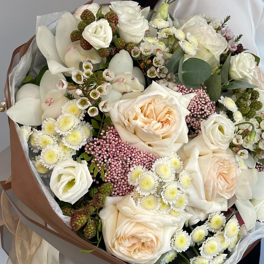 Ваксфлауэр – 2 шт.Лизиантус – 2 шт.Озотамнус – 4 шт.Эвкалипт – 2 шт.Роза Эквадор – 7 шт.Сантини – 5 шт.Фисташка – 4 шт.орхидея – 7 шт.Рубус – 4 шт.