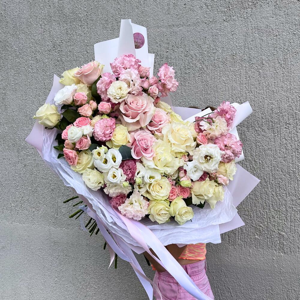 Представляем вашему вниманию уникальный авторский большой букет, созданный специально для ценителей красоты и элегантности. Этот букет включает в себя разнообразие прекрасных цветов, таких как розы и эустома, чтобы подарить вам незабываемые моменты и яркие эмоции.