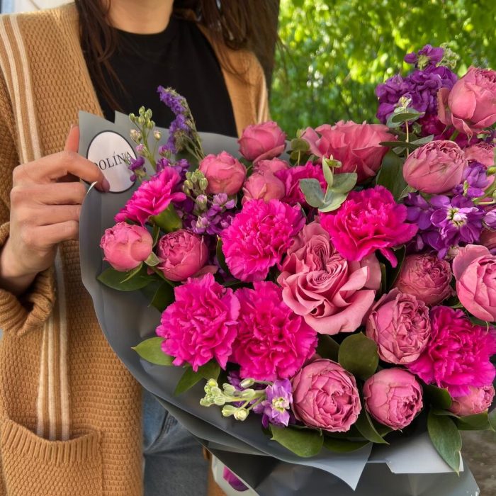 Маттиола – 7 шт.Роза пионовидная – 2 шт.Гвоздика – 8 шт.Роза кустовая – 3 шт.Эвкалипт – 2 шт.уракрвка дизайнерская – 1 шт.Зелень – 1 шт.
