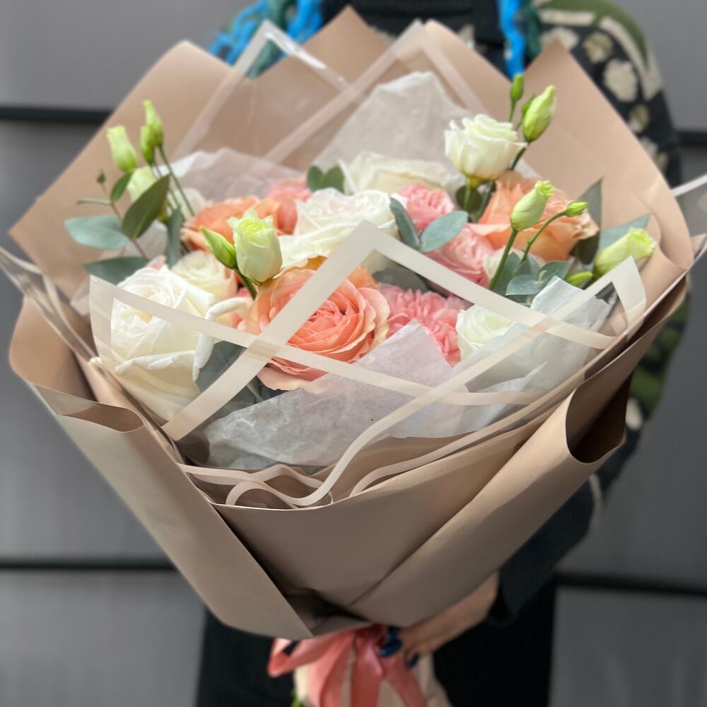 роза пионовидная вайт o’hara – 3 шт.Роза пионовидная кахала – 3 шт.Мадам бомбастик – 2 шт.Диантус одноголовый – 3 шт.эустома розита вайт – 2 шт.Эвкалипт – 3 шт.Пленка матовая – 5 шт.Тишью – 1 шт.Лента атласная – 2 шт.