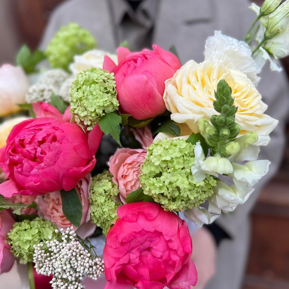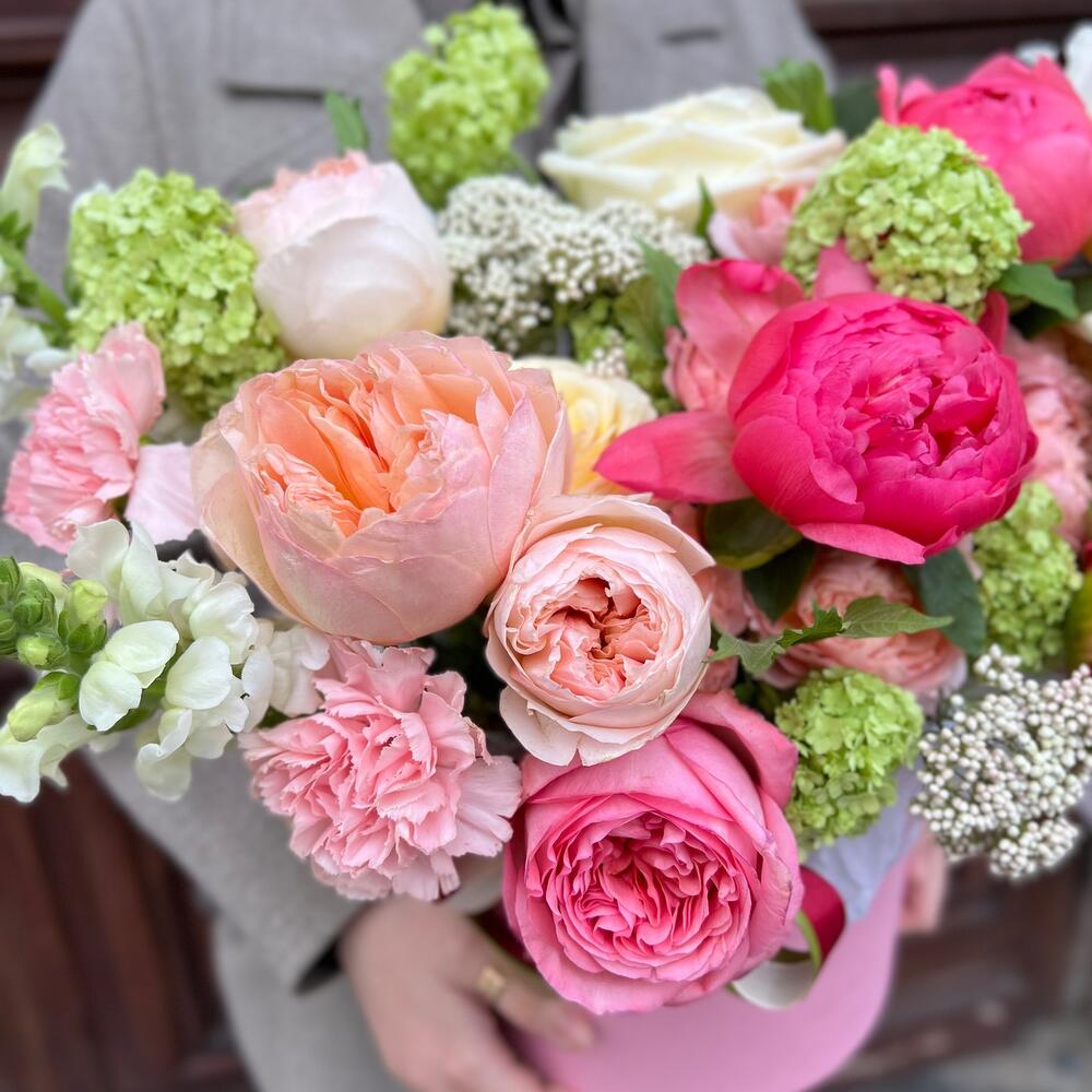 Вибурнум – 2 шт.Озотамнус – 2 шт.Лента атласная – 2 шт.Тишью – 1 шт.Диантус – 3 шт.Коробка шляпная – 1 шт.Роза остина пионовидная – 2 шт.Оазис флористический – 1 шт.Эустома белая махровая – 1 шт.джульетта роза пионовидная – 1 шт.Пион коралл шарм – 3 шт.антиринум – 3 шт.роза кэндллайт – 3 шт.