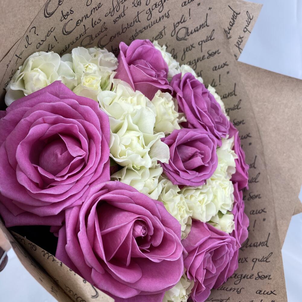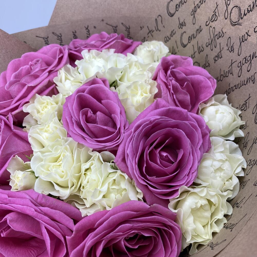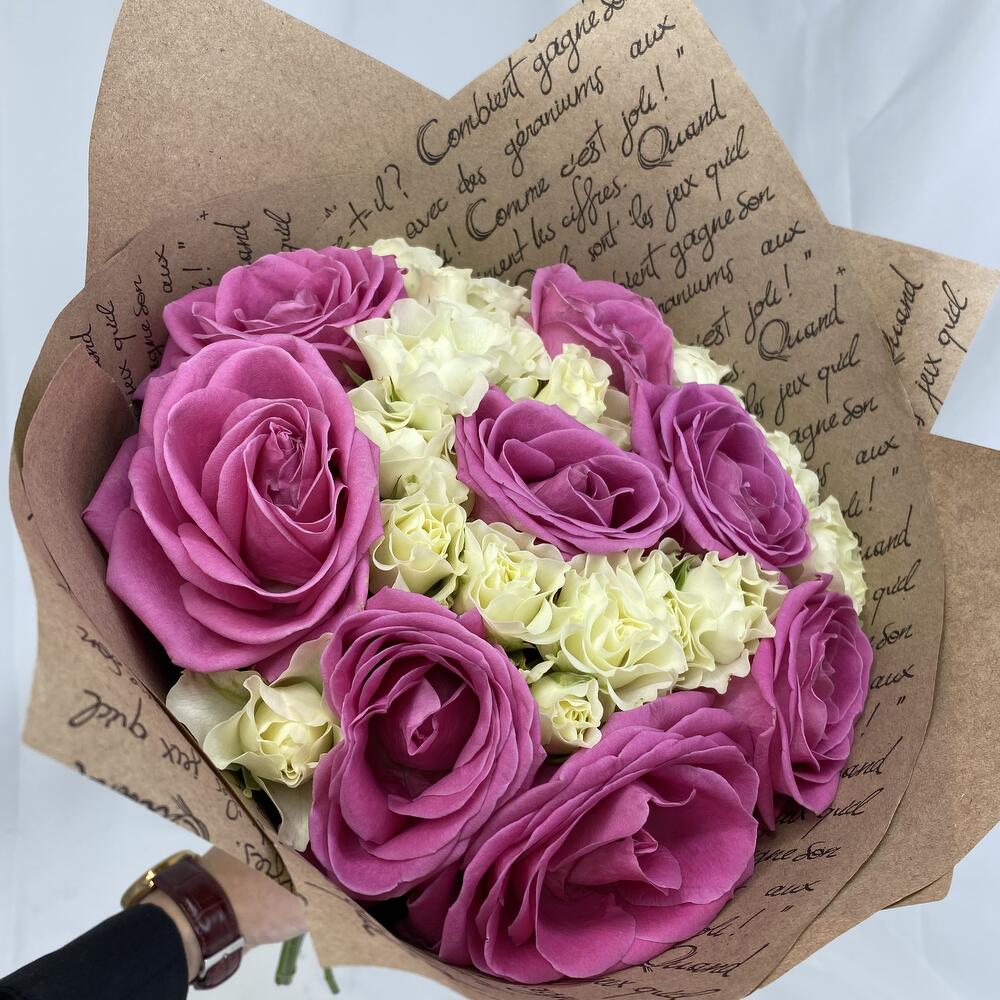 Роза кустовая – 7 шт.Роза одноголовая – 8 шт.Атласная лента – 1 шт.Крафт-упаковка – 3 шт.