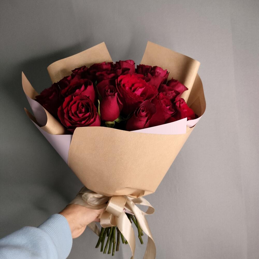 Атласная лента – 1 шт.Корейская пленка – 2 шт.роза красная кения (40 см) – 25 шт.