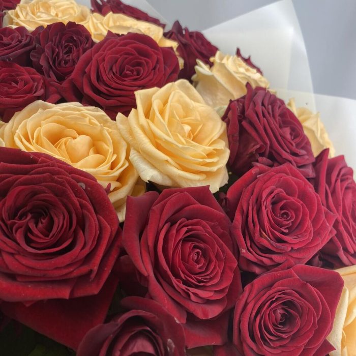 Красная роза – 20 шт.Персиковая Роза – 15 шт.Упаковка – 3 шт.Атласная лента – 1 шт.