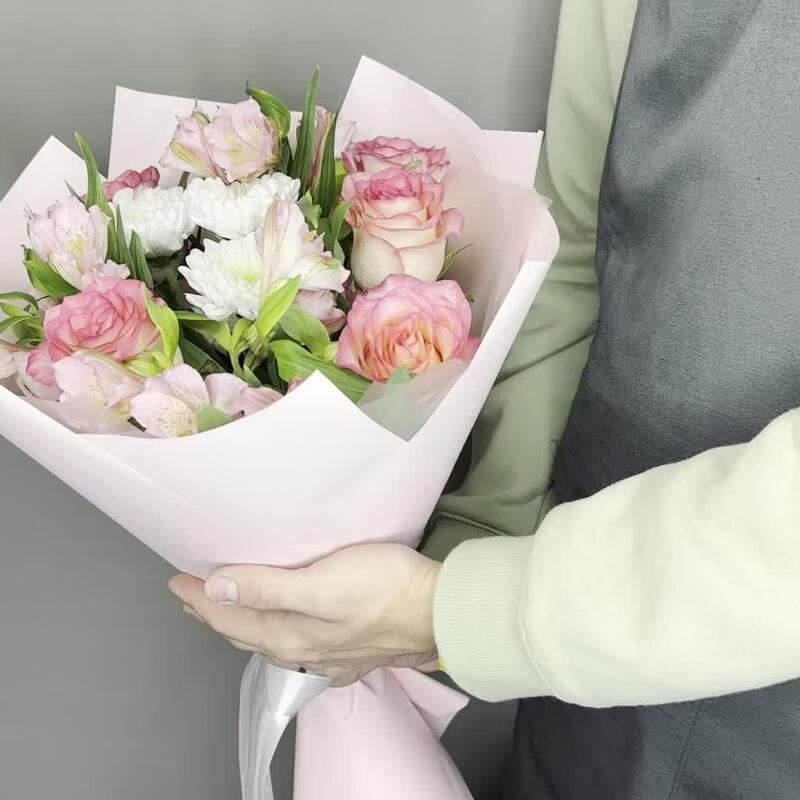 Букет из альстромерий, роз и кустовой хризантемы