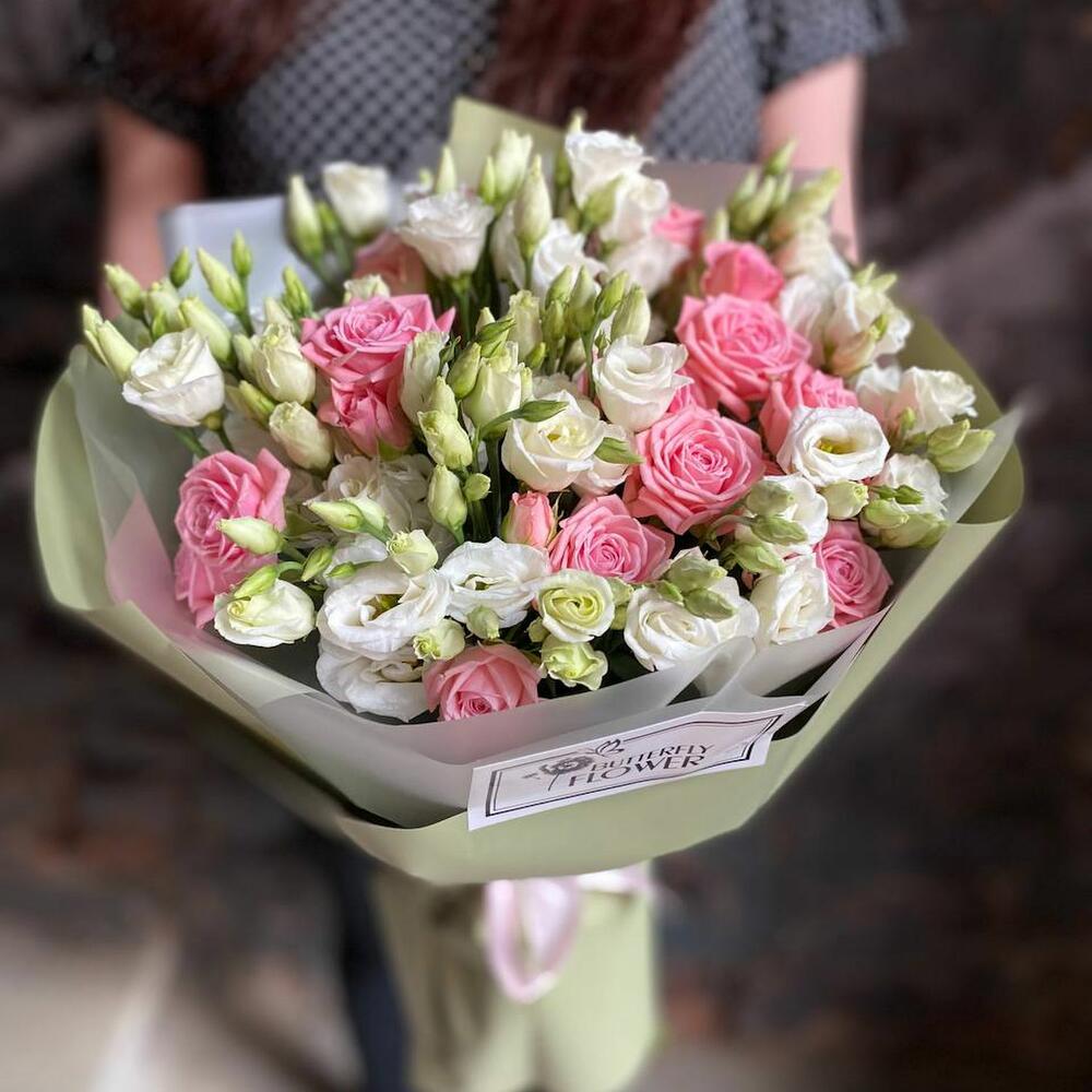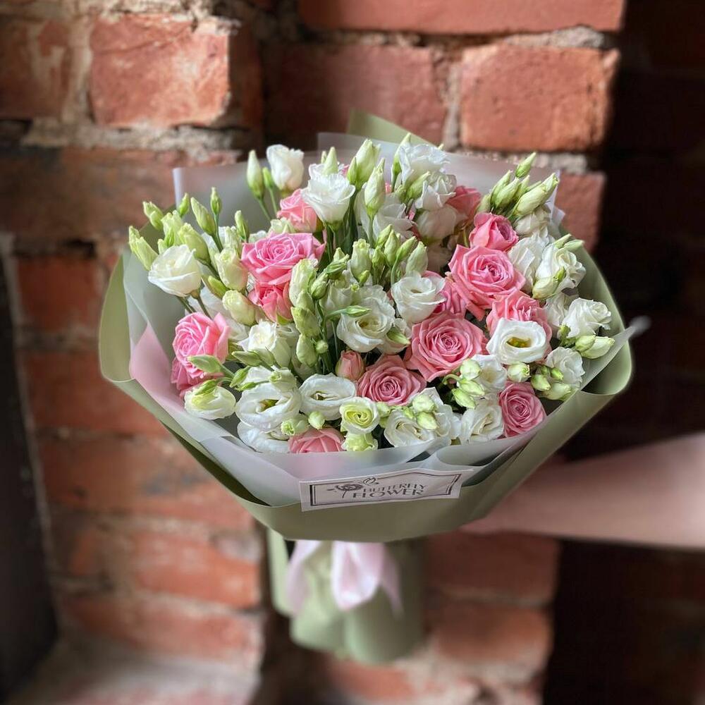 Букет из белой эустомы и кустовой пионовидной розы в дизайнерской упаковке “Бомбастик”