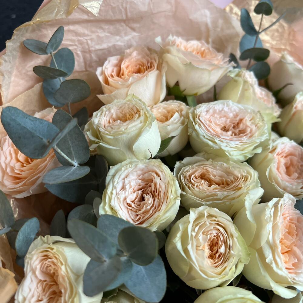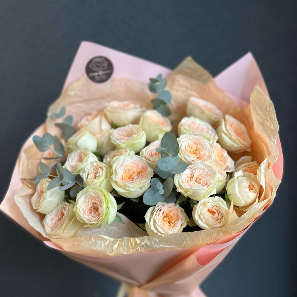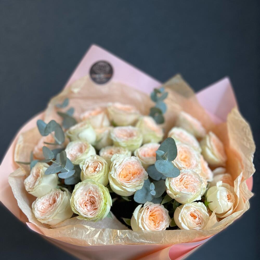 Кустовая роза – 7 шт.Эвкалипт – 5 шт.декоративная упаковка – 1 шт.Атласная лента – 1 шт.