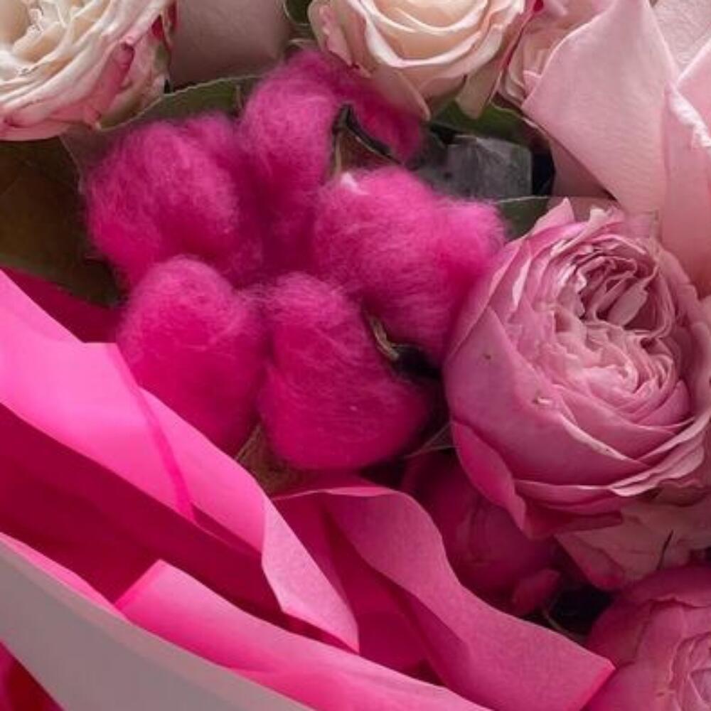 Салал – 5 шт.Роза – 3 шт.Кустовая роза – 7 шт.Лента атласная – 2 шт.Тишью – 4 шт.Пионовидная роза – 2 шт.Пленка матовая – 1 шт.Хлопок натуральный – 3 шт.