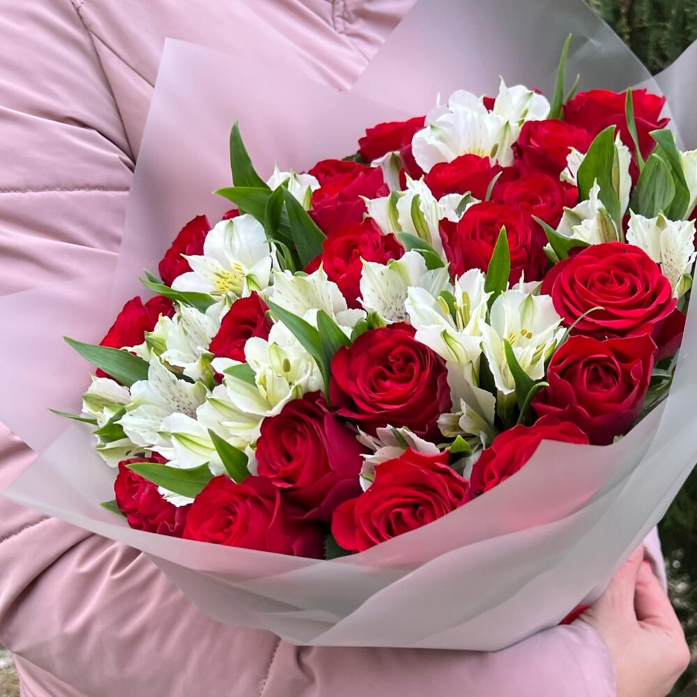 Роза красная – 25 шт.Альстромерия – 7 шт.Пленка матовая – 2 шт.