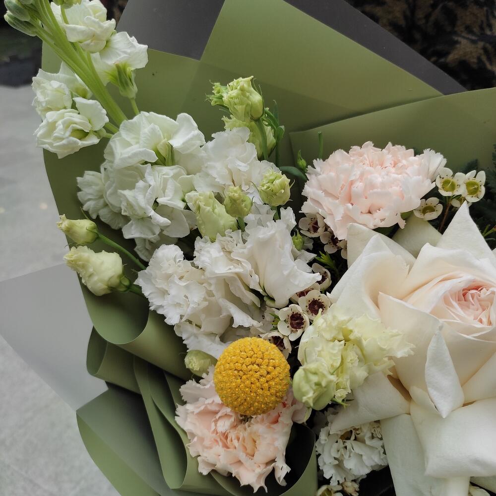 Букет из розы, белой маттиолы и диантуса