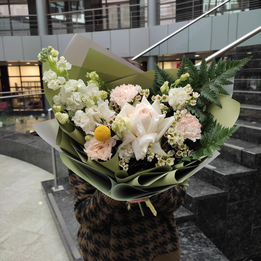 Роза – 1 шт.Лизиантус – 2 шт.Ваксфлауэр – 2 шт.Маттиола – 1 шт.Диантус – 3 шт.Папоротник – 2 шт.Лента – 2 шт.Упаковка дизайнерская – 2 шт.